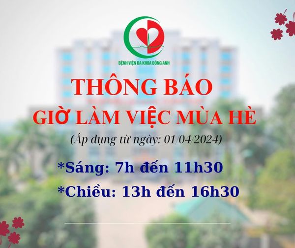 Để mọi người chủ động sắp xếp công việc và bố trí thời gian đến khám chữa bệnh, Bệnh viện đa khoa Đông Anh xin thông báo giờ làm việc mùa hè khu khám bệnh ngoại trú bắt đầu từ ngày 01/04/2024 như sau: