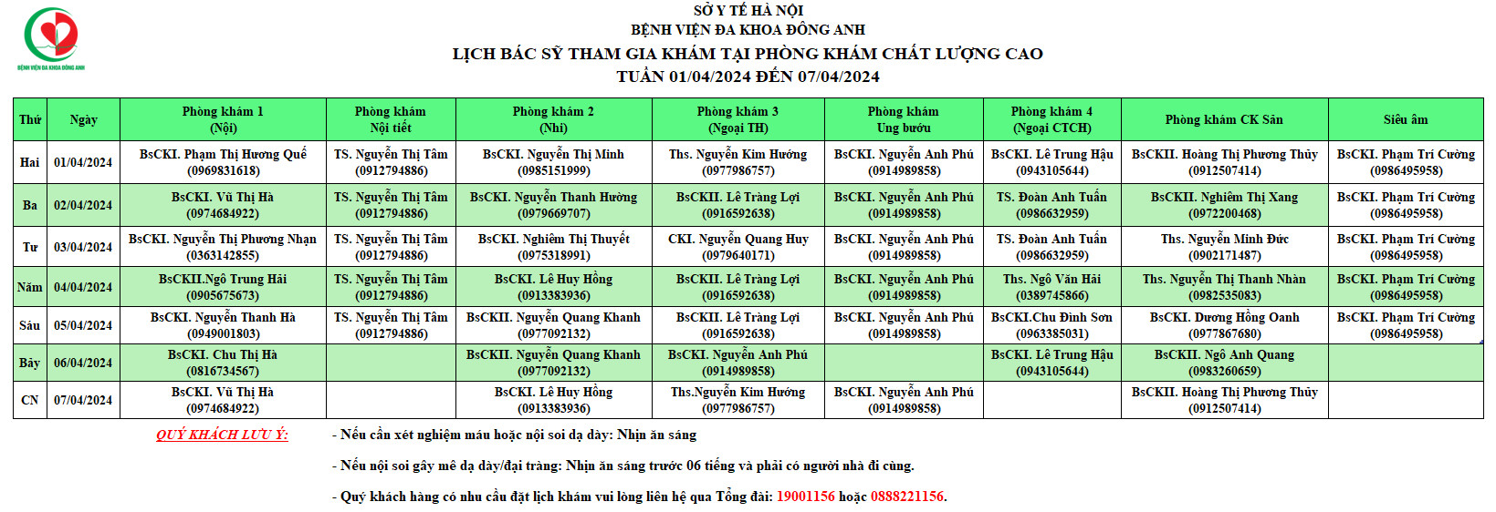 LỊCH KHÁM TẠI PHÒNG KHÁM CHẤT LƯỢNG CAO