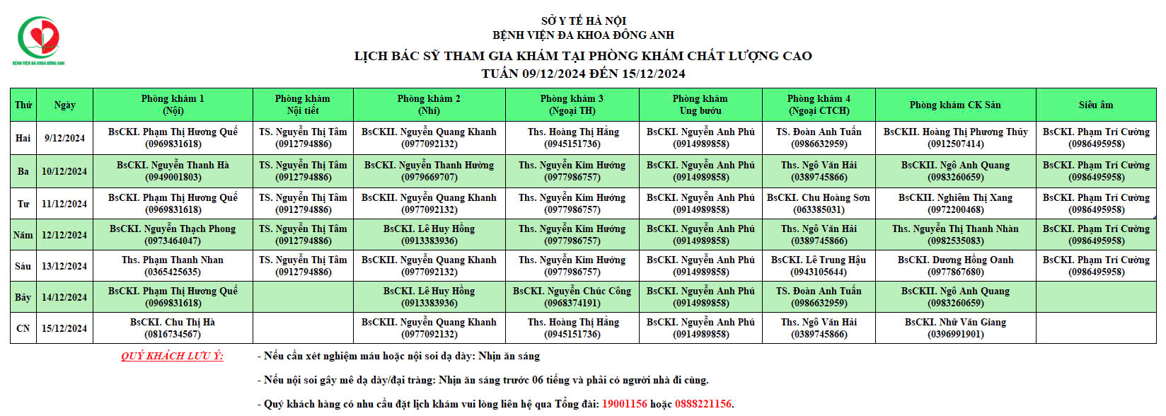LỊCH KHÁM TẠI PHÒNG KHÁM CHẤT LƯỢNG CAO