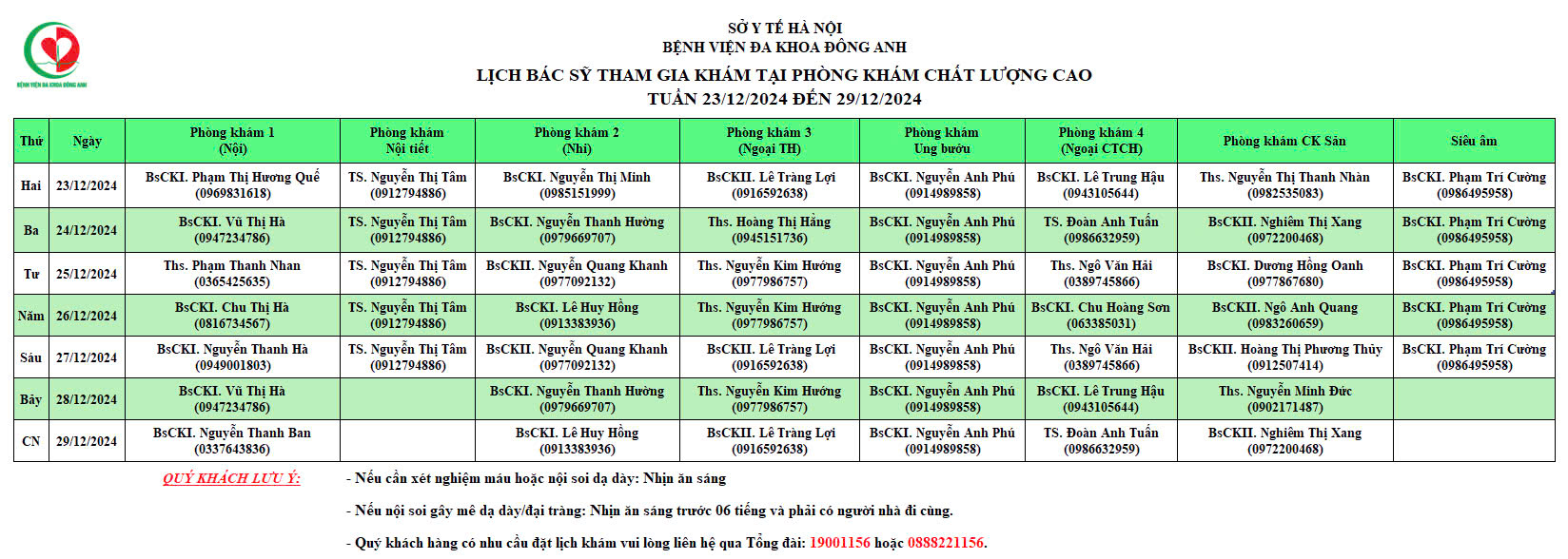 LỊCH KHÁM TẠI PHÒNG KHÁM CHẤT LƯỢNG CAO