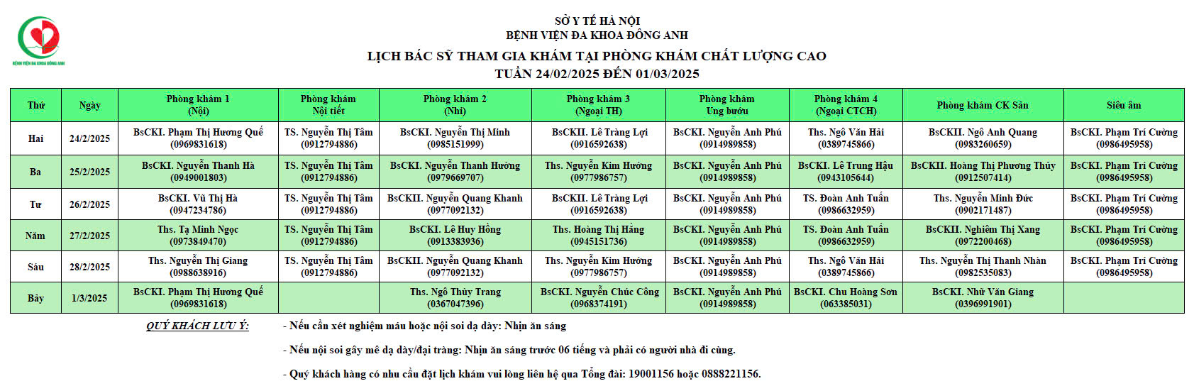 LỊCH KHÁM TẠI PHÒNG KHÁM CHẤT LƯỢNG CAO