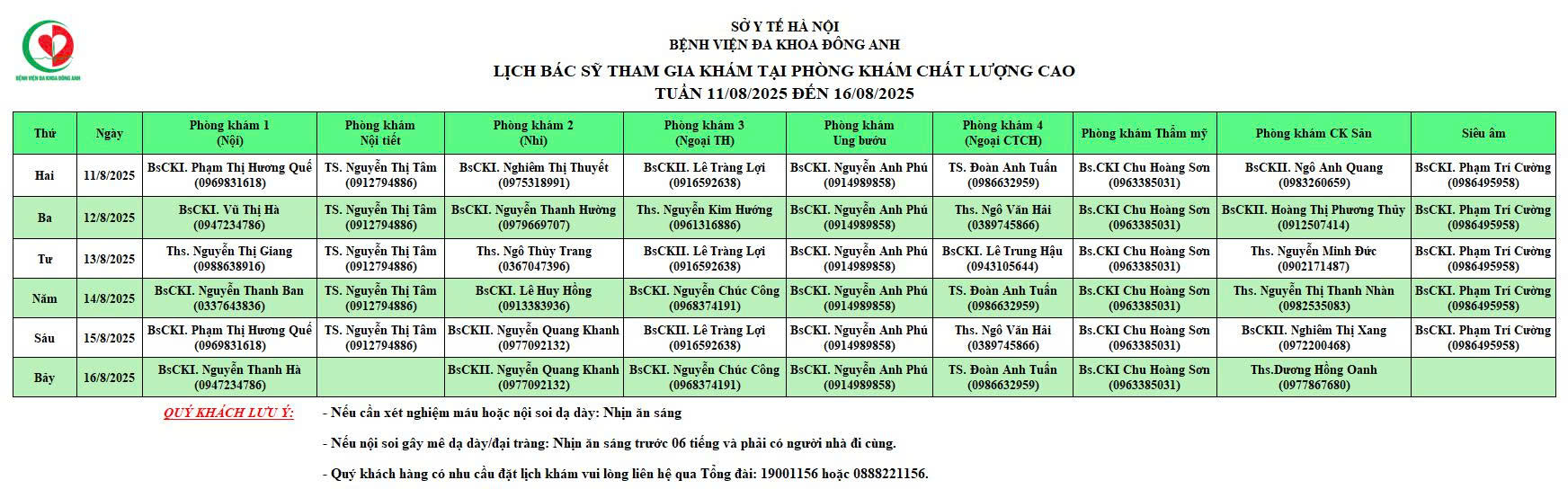 LỊCH KHÁM TẠI PHÒNG KHÁM CHẤT LƯỢNG CAO