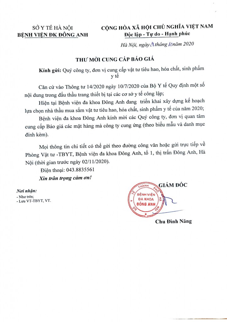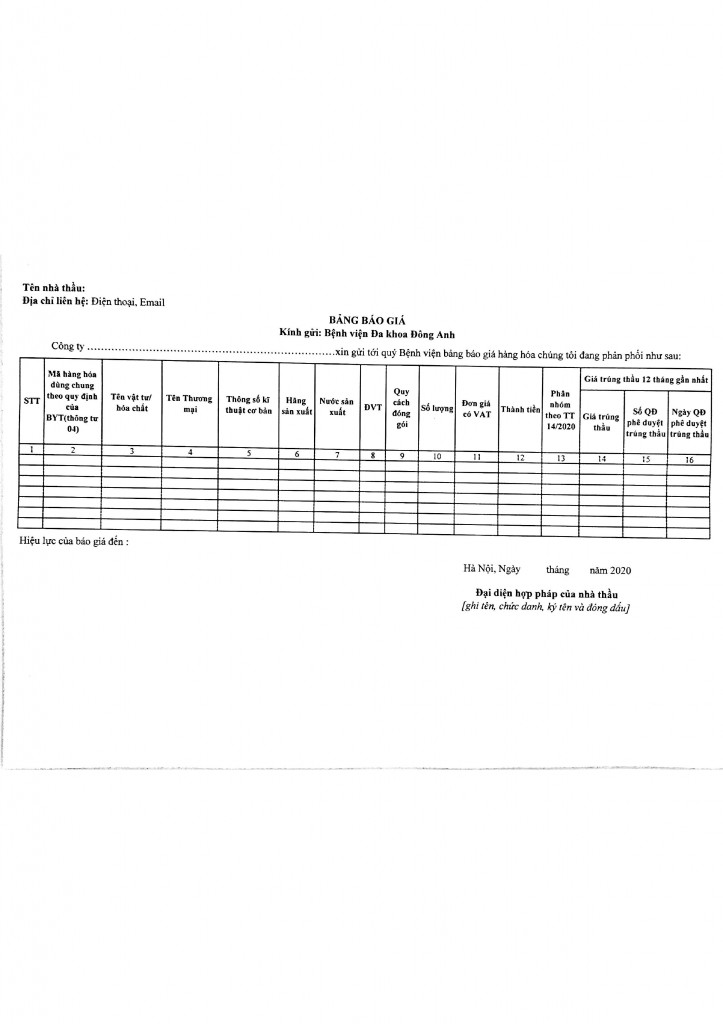 Bệnh viện đa khoa Đông Anh kính mời các Quý công ty, đơn vị quan tâm cung cấp Báo giá các mặt hàng mà công ty cung ứng (theo biểu mẫu và danh mục đính kèm).